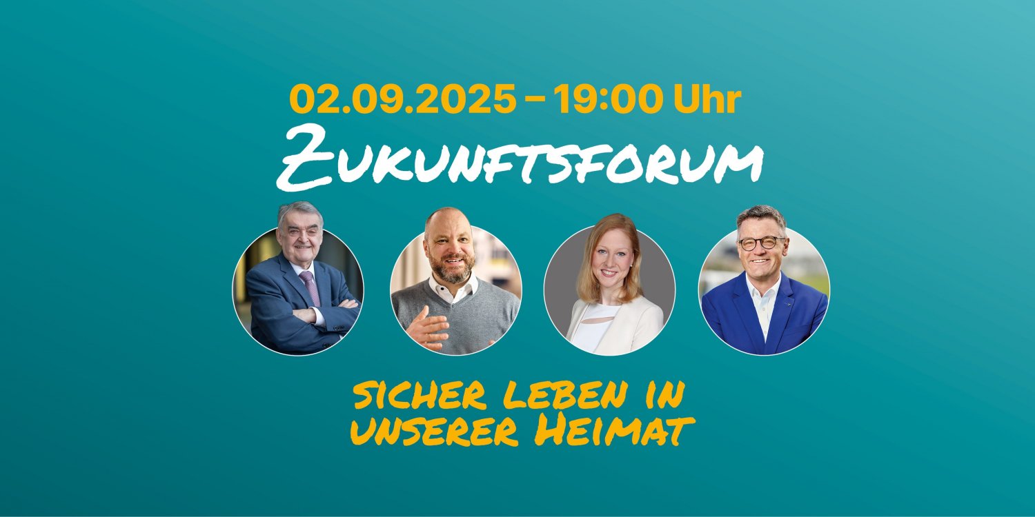 Kommen Sie am 02.09.2025 zum Zukunftsforum mit Herbert Reul MdL, Minister des Innern des Landes Nordrhein-Westfalen, zum Thema „Sicher leben in unserer Heimat“.