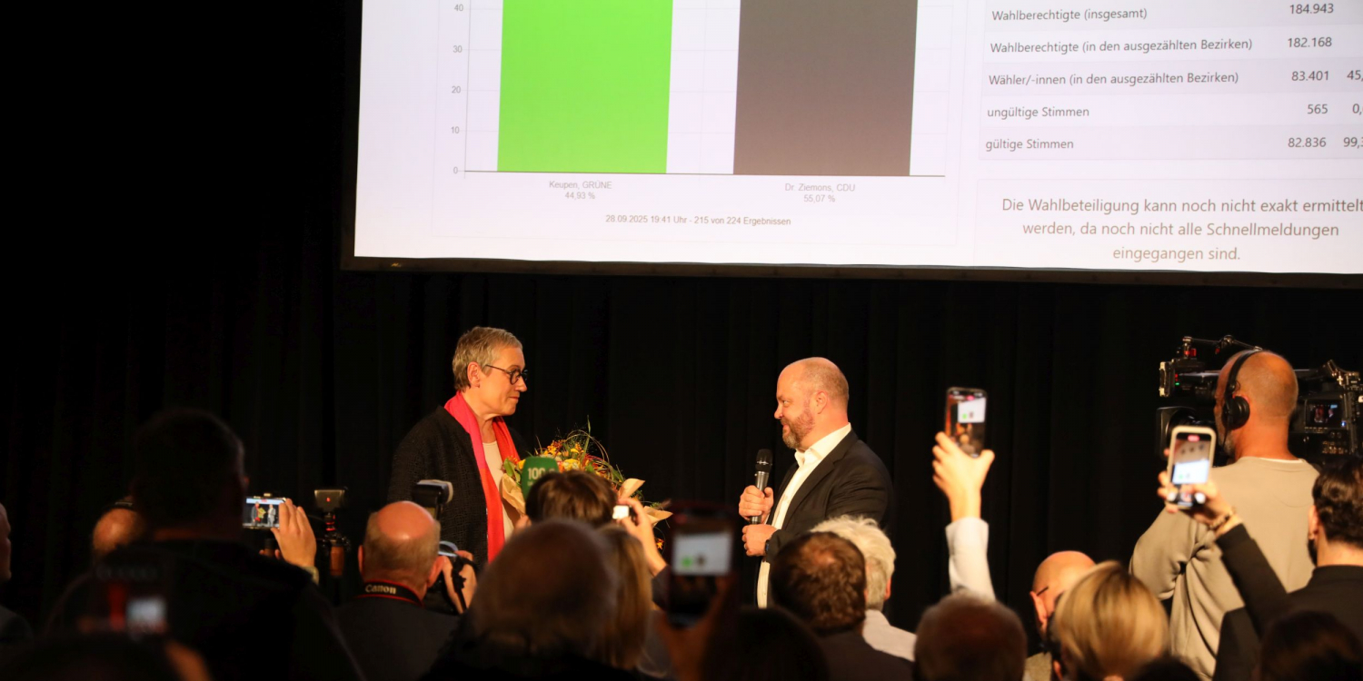 Mit 56,03% der Stimmen konnte sich unser Kandidat Dr. Michael Ziemons bei der Stichwahl um das Oberbürgermeisteramt durchsetzen. Mit 50.692 Stimmen (bei einer Wahlbeteiligung von 49,25%) konnte am 28.09. am Abend de Erfolg gefeiert werden. Offiziell wird seine Amtszeit ab dem 01.11.2025 beginnen.