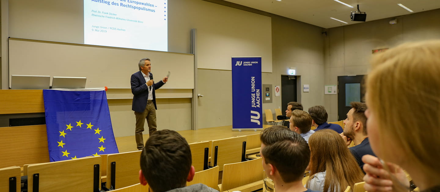 Im CARL der RWTH Aachen hatten wir den Politologen Professor Frank Decker von der Rheinischen Friedrich-Wilhelms-Universität in Bonn zu Gast. Bei der Veranstaltung, die gemeinsam mit dem RCDS Aachen durchgeführt wurde, lag das Hauptaugenmerk auf die anstehenden Europawahlen.